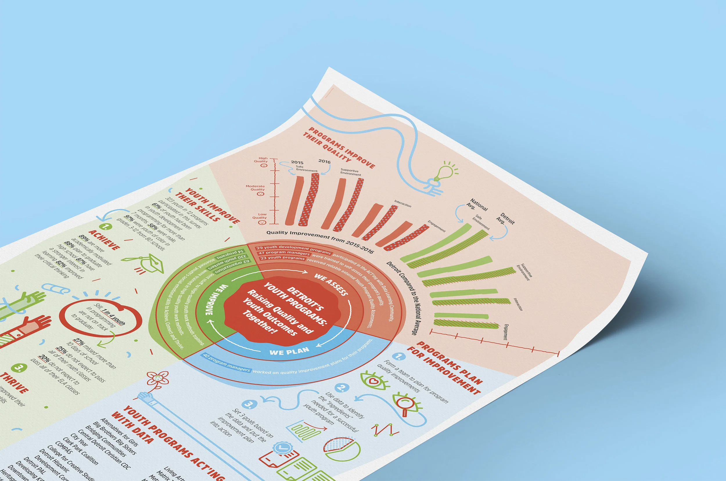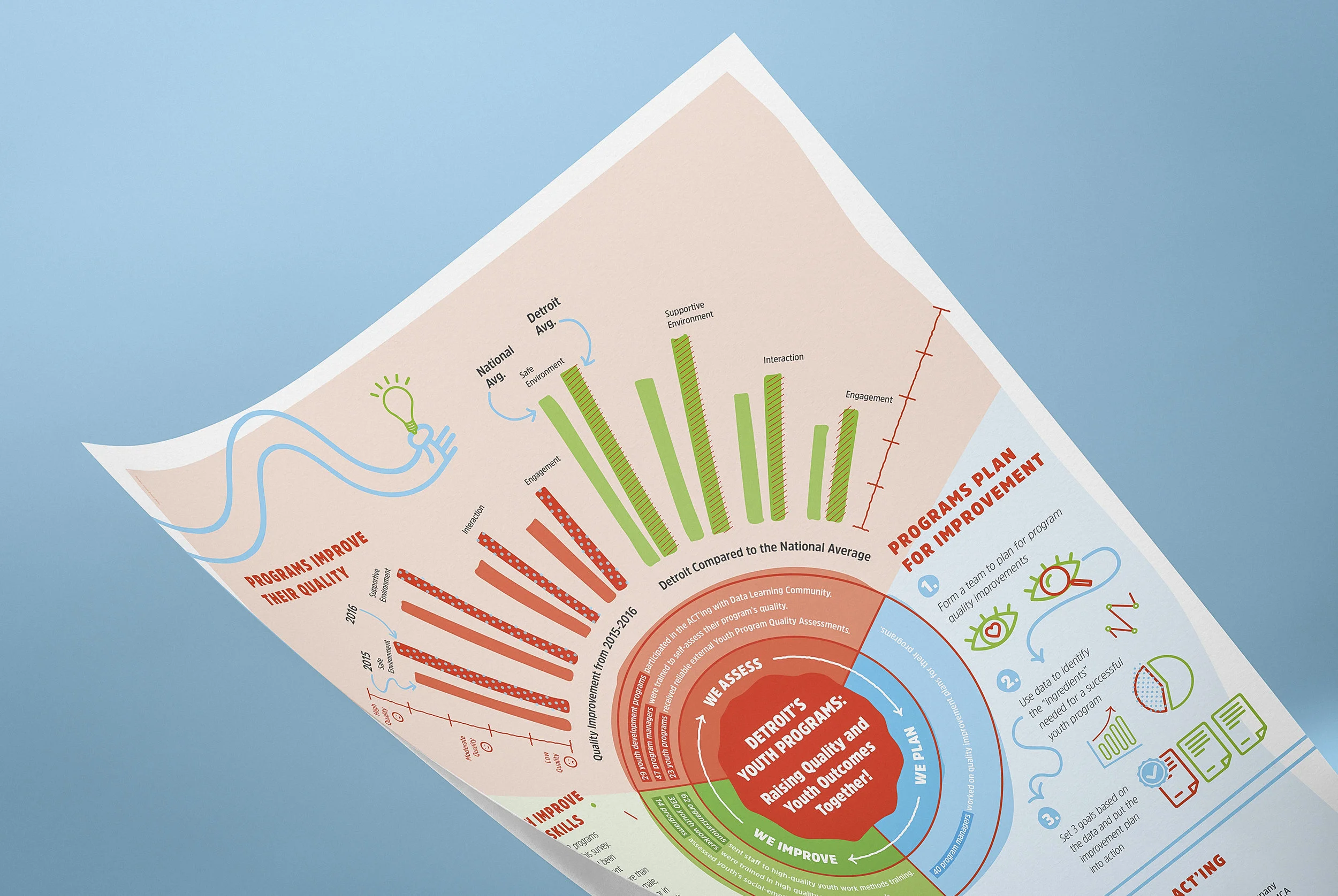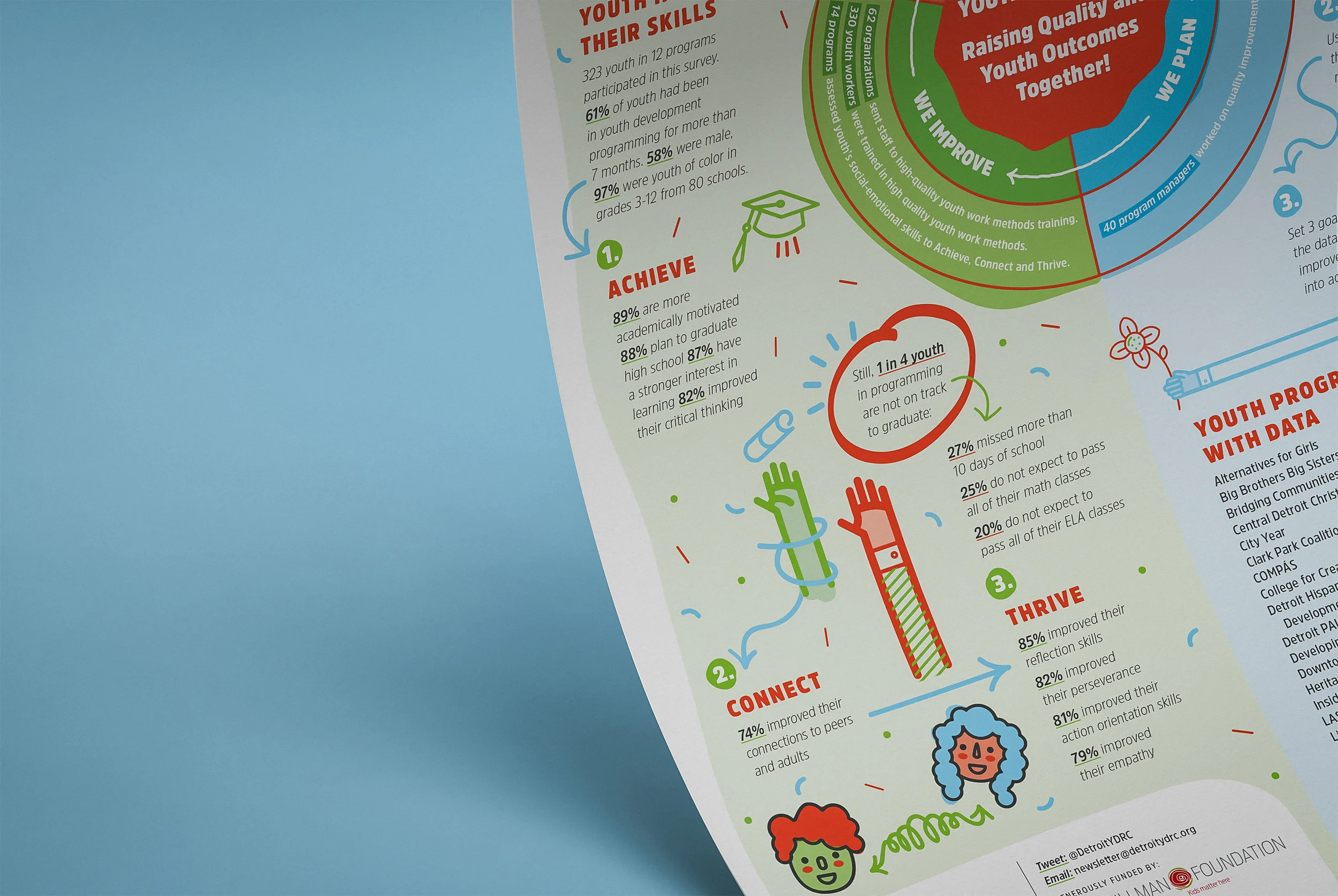 To get things moving, we began with a series of sketches. How do you piece together all sorts of metrics from quality improvements in youth development programming to Detroit's youth achievement rates vs. the national average? Invariably, the urge strikes to turn it all into one giant assemblage of pie charts and dramatic looking line graphs. By making numbers more aesthetic and somehow tangible to readers, will it help them make sense of something quickly? Will it confuse? That's why sketching can be a useful activity at this stage. Before we fuss over colors, pictographs, and quantitative analysis, we work out a layout's composition by drawing it. Eventually this process lead to the design of an 11" x 17" poster that explained YDRC's model for raising the quality of youth development programs in Detroit (see above↑ & below↓).